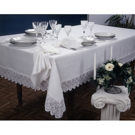 Servizio tavola 12 posti con tovaglia in tessuto jacquard di misto lino rifinita con pizzo macramè su organza.