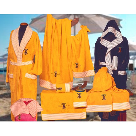 Completo bagno in spugna di puro cotone 100% cinigliata colorata con ricamo in viscosa ed applicata una fascia di spugna di puro cotone 100% cinigliata bianca con righe in tinta. Accappatoio unisex con cappuccio.