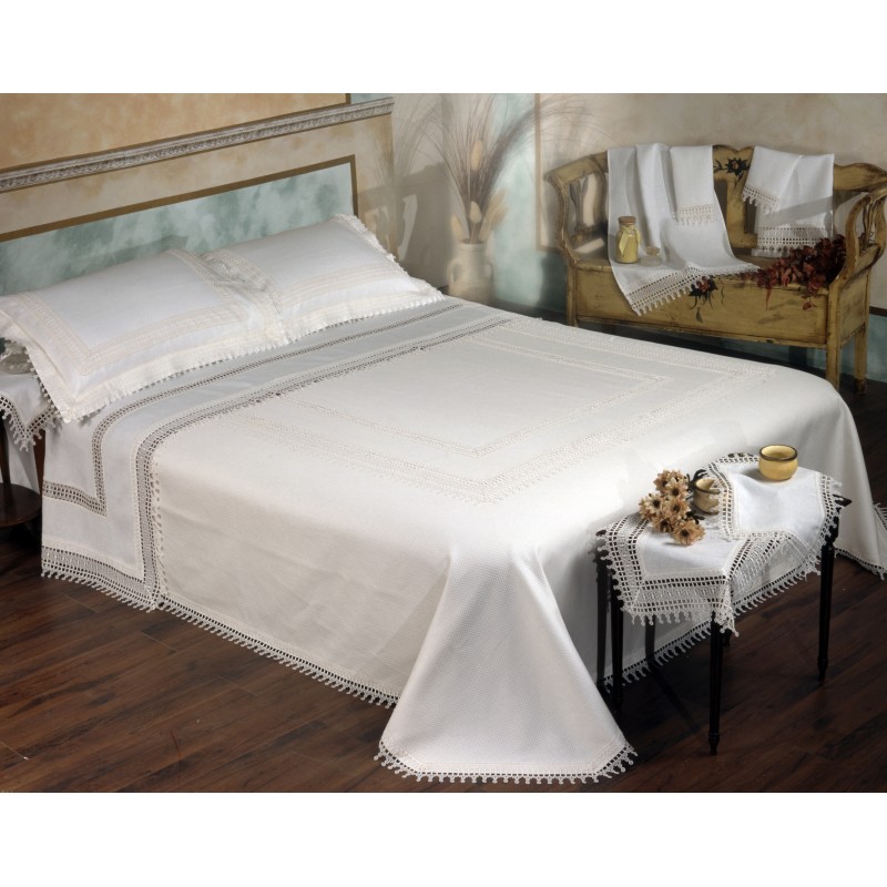 Completo letto metrimoniale 4Pz realizzato in puro lino 100% arricchito con tramezzi e bordura in fine pizzo macramè; copriletto matrimoniale in tessuto jacquard a nido d'ape di misto lino.