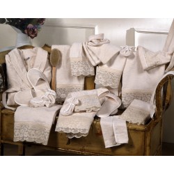 Coppia di asciugamani in spugna di puro cotone 100% cinigliata con applicazioni di pregiato pizzo in puro cotone.